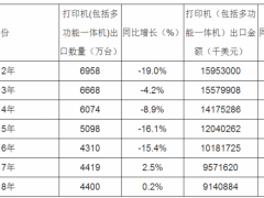 根據(jù)中國(guó)海關(guān)數(shù)據(jù)顯示:2018年1-12月中國(guó)打印機(jī)(包括多功能一體機(jī))出口數(shù)量為4400萬臺(tái),同比增長(zhǎng)0.2%;2018年1-12月中國(guó)打印機(jī)(包括多功能一體機(jī))出口金額為9140884千美... [詳細(xì)]