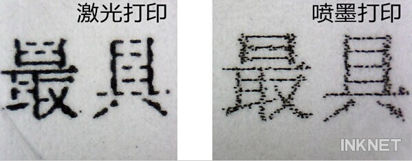 激光打印能看到有斷點(diǎn)存在,噴墨打印出來的文字由墨點(diǎn)拼成,依稀可以看出宋體字的筆鋒