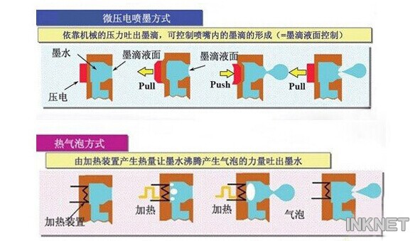 噴墨打印其實(shí)分為微壓電打印和熱發(fā)泡打印兩種,從原理上講,無論何種方式,都是要對(duì)墨水施加壓力,使墨滴準(zhǔn)確地受控噴出,落在打印介質(zhì)表面相應(yīng)的位置上。熱發(fā)泡技術(shù)是在打印頭(噴墨室的硅基底)上制作電加熱元件(通常是熱電阻),通電時(shí)加熱器產(chǎn)生的瞬間高溫使周圍的墨水迅速氣化,體積突然增大產(chǎn)生的壓力就把墨水“擠出”噴嘴,形成噴向打印介質(zhì)的墨滴。由愛普生主導(dǎo)的微壓電打印技術(shù)則利用了壓電晶體在兩端電壓變化的情況下伸展或收縮的特性,通過電信號(hào)驅(qū)動(dòng)噴墨室內(nèi)的壓電晶體運(yùn)動(dòng),壓迫墨水噴出。