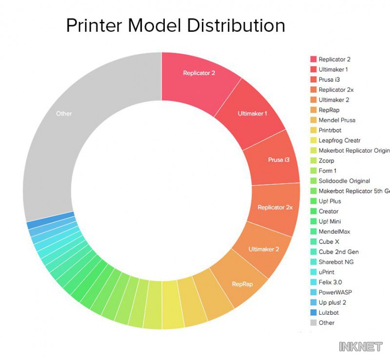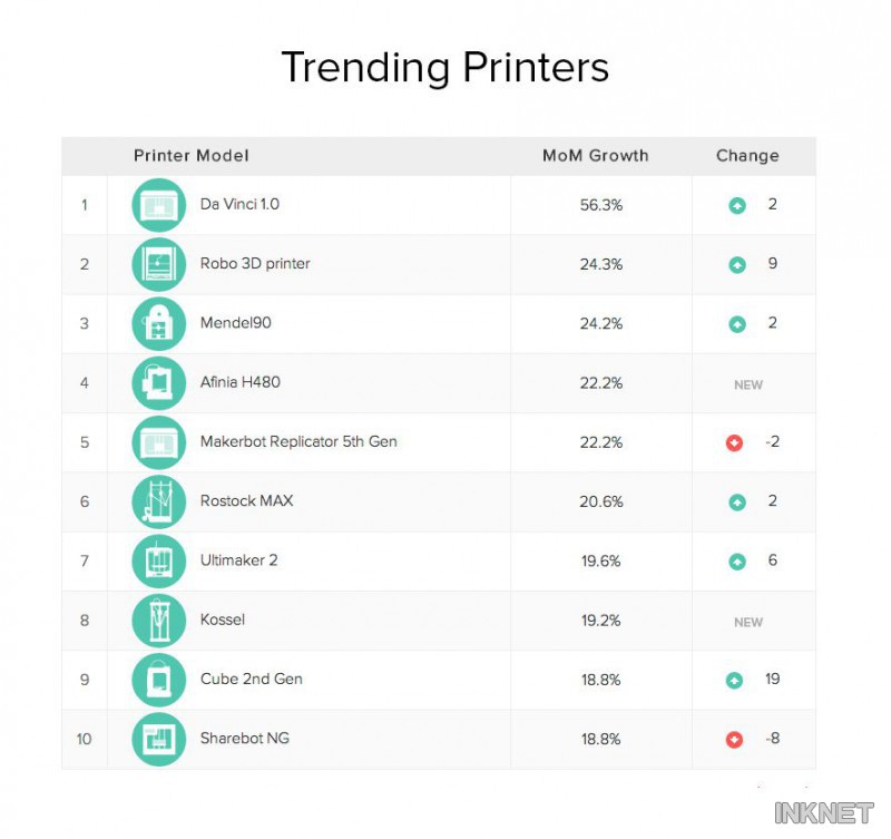 在用戶擁有量增長最快的3D打印機排行榜上,來自臺灣的 Da Vinci 1.0以56.3%的月增幅高居第一。這與該產(chǎn)品的低價策略有一定的關(guān)系,Da Vinci 1.0的售價大約為500美元左右。