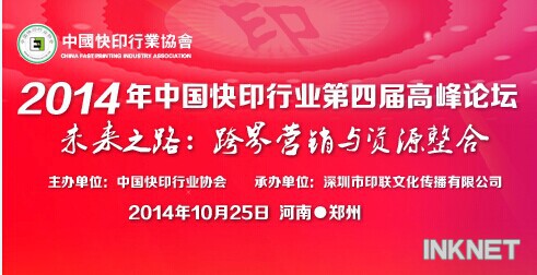 由中國快印行業(yè)協(xié)會主辦,深圳市印聯(lián)文化傳播有限公司承辦的中國快印行業(yè)一年一度的級別最高、規(guī)模最大的“2014年中國快印行業(yè)第四屆高峰論壇”將于10月在河南鄭州盛大召開!本屆論壇以“跨界營銷與資源整合”為主題,屆時將邀請國家有關(guān)政府職能部門負(fù)責(zé)人、國內(nèi)快印行業(yè)資深專家以及知名快印企業(yè)總裁等,就當(dāng)前中國快印行業(yè)發(fā)展現(xiàn)狀及未來發(fā)展趨勢等焦點課題展開深入交流與互動!