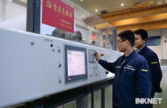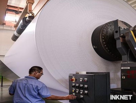 工人在數十噸重的銅版紙紙卷前操作設備