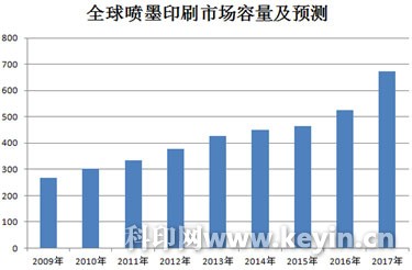噴墨印刷是全球印刷業(yè)發(fā)展的焦點(diǎn),在占全球總規(guī)模一半的北美印刷市場,年收入增長的70%來自噴墨印刷。根據(jù)皮拉國際(Pira International)的統(tǒng)計(jì),2009年噴墨印刷的市場總量是268億美元,較2005年增長了58.2%。在2011年,市場規(guī)模達(dá)到了334億美元,預(yù)計(jì)到2015年市場總量將達(dá)到465億美元,2017年市場總量將達(dá)到673億美元,平均復(fù)合增長將保持在10.3%左右。如下圖所示: