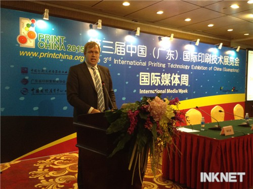 由中國印刷及設備器材工業(yè)協(xié)會主辦的PRINT CHINA 2015國際媒體周活動2014年12月9日-11日在東莞會展國際大酒店如意廳舉辦,其中,12月10日,舉行了“印刷行業(yè)形勢及展商參展方案介紹會”,佳能中國有限公司專業(yè)產(chǎn)品打印本部市場部高級經(jīng)理康品德發(fā)表了《數(shù)碼印刷 全在佳能》的演講。