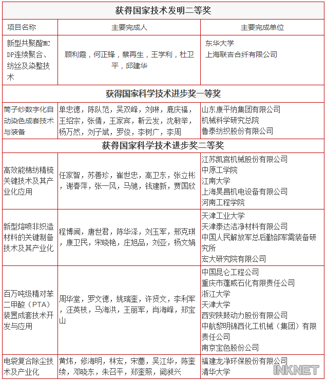 1月9日,中共中央、國務(wù)院在京舉行國家科技獎(jiǎng)勵(lì)大會(huì)。黨和國家領(lǐng)導(dǎo)人習(xí)近平、李克強(qiáng)、劉云山、張高麗出席大會(huì)并為獲獎(jiǎng)代表頒獎(jiǎng)。李克強(qiáng)代表黨中央、國務(wù)院在大會(huì)上講話,張高麗主持大會(huì)。2014年度國家科學(xué)技術(shù)獎(jiǎng)勵(lì)共授獎(jiǎng)318項(xiàng)成果、8位科技專家和1個(gè)外國組織。其中,紡織行業(yè)獲得國家科學(xué)技術(shù)進(jìn)步一等獎(jiǎng)一項(xiàng),國家科學(xué)技術(shù)進(jìn)步二等獎(jiǎng)四項(xiàng),國家技術(shù)發(fā)明二等獎(jiǎng)一項(xiàng)。