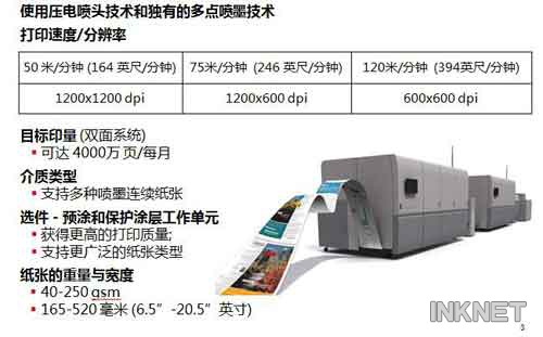 RICOH Pro VC60000支持多種噴墨連續(xù)紙張,使用壓電噴頭技術(shù)和具有分辨率為1200×1200dpi的獨有多點噴墨技術(shù)。新機可采用雙面系統(tǒng),印刷幅面在165mm-520mm。機器采用輪轉(zhuǎn)供紙方式,其印刷速度可高達120m/分鐘。每月印量高達4000萬頁,且最高可印刷克重達250gsm的高光涂布紙張。系統(tǒng)還可以選配一套底涂和印后保護性上光裝置。