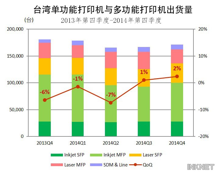 根據(jù)IDC2014年第四季臺灣打印機市場調(diào)查報告顯示,臺灣打印機總出貨量為171,126臺,本季打印機出貨較上一季成長2%,與去年同期相比則衰退6%。