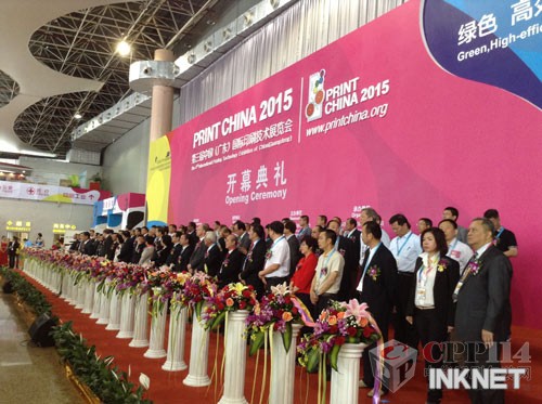 雖然只是既定程序式的儀式,開幕式的安保工作非常嚴(yán)密。種種細(xì)節(jié)顯示出主辦方及當(dāng)?shù)卣畬rintChina2015的重視。在舉行開幕式的的3號(hào)館序廳的各個(gè)入口,只有持有主辦方邀請函及媒體證的與會(huì)者方可入內(nèi)。筆者所在的單位既是媒體也是參展商,所持為展商證,初始被安保人員拒絕入內(nèi),好說歹說也不讓進(jìn)。所幸遇到了主辦方媒體的一位朋友,才順利的領(lǐng)著攝影師入內(nèi)。該序廳為東西走向,中部為開幕式舉辦區(qū)——又分成主禮舞臺(tái)區(qū)、觀眾區(qū)、拍照區(qū),安保人員在觀眾區(qū)的東、西、南三面排成三排,將觀眾區(qū)與外面的人員阻隔開來。