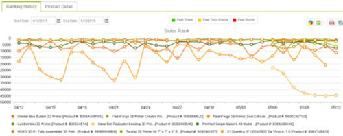如下圖可見,在調(diào)查的樣品中,閃鑄科技 Creator Pro以及組裝的ROBO 3D R1機(jī)器的銷售排名已經(jīng)持續(xù)領(lǐng)先于其他打印機(jī)。圖表同樣顯示MakerBot Replicator近期形勢(shì)欠佳,盡管有關(guān)該產(chǎn)品的數(shù)據(jù)僅有大約一周的。