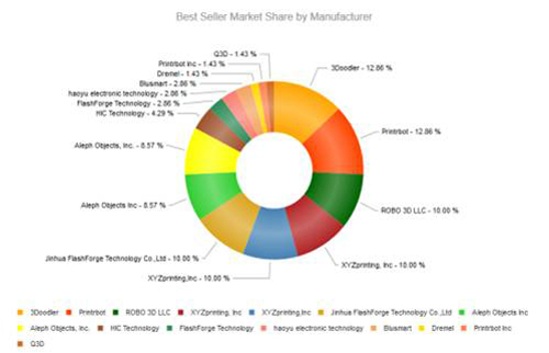 在亞馬遜可選擇的打印機(jī)品牌更多。雖然有效數(shù)據(jù)的時(shí)間范圍更短,但下圖仍能幫各位相當(dāng)準(zhǔn)確地評(píng)估出哪些制造商在亞馬遜在線銷量最好。3Doodler 在亞馬遜銷售期3D打印筆,售價(jià)為145美元多一點(diǎn),目前銷售處于領(lǐng)先地位。 盡管從技術(shù)角度而言,這并不是3D打印機(jī),但它還是被歸類為3D打印機(jī)。緊隨其后的是Printrbot。它們?cè)趤嗰R遜提供一系列產(chǎn)品,包括旗艦產(chǎn)品Printrbot Simple metal,售價(jià)僅為599美元。除此之外,排名前五的還有ROBO 3D,XYZprinting以及閃鑄科技(Flashforge)。