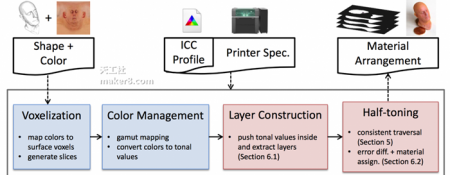 “在本文中,我們充分利用了幾十年來學術界對于彩色成像、色彩管理和2D彩色打印的知識成果,以最大限度地提高質量和充分挖掘高分辨率多材料3D打印機的功能,并將其變?yōu)楝F(xiàn)實。”研究人員寫道。