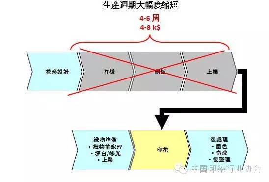 2. 20世紀80年代以來,紡織品印花的市場發(fā)生了很大的變化。市場希望印花企業(yè)能夠滿足“快速反應,周期短;彈性生產(chǎn),靈活多變;高品質,色彩豐富;低成本;生態(tài)環(huán)保”等要求。傳統(tǒng)印花因制版,對小樣等原因,制作小樣時間通常需要2周左右時間。在生產(chǎn)繁忙季節(jié),企業(yè)根本無法滿足客戶快速試樣的要求。考慮到成本因素,對于小批量,多花色的時裝訂單,很多工廠更是有心無力。而數(shù)碼印花工藝恰恰契合了當今市場快速變化的要求。無需制版,按照客戶的要求,可實現(xiàn)1米起印。正常情況下,采用數(shù)碼印花工藝,企業(yè)1~2天內就可交單。大大縮短了生產(chǎn)周期。參看圖4.