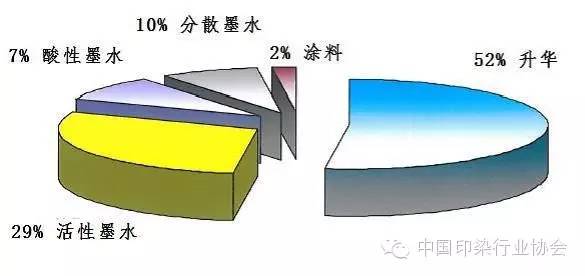 所謂染料墨水是由水溶性或溶劑性的活性,分散,酸性染料調配而成,染料能夠完全溶解于水或溶劑中,過濾后的染料墨水不含顆粒性成分,故不容易造成噴頭的堵塞。染料墨水的最大特點是色域非常廣,色彩艷麗。且染料成分及發(fā)色機理與傳統(tǒng)印花最接近,所以印花效果(滲透,手感,色牢度等)與傳統(tǒng)印花最為接近,該工藝面料適用面廣,棉、毛、絲、麻、滌綸、錦綸等纖維面料均可使用相應染料墨水進行印花。目前該工藝已成為數(shù)碼印花的主流發(fā)展方向。本文也將結合該工藝進行詳細介紹。以上3種工藝在數(shù)碼印花市場所占份額參見(圖5)。