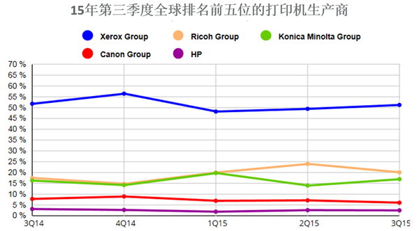 2. 2015年第三季度打印機(jī)全球出貨量市場占有率及排名表