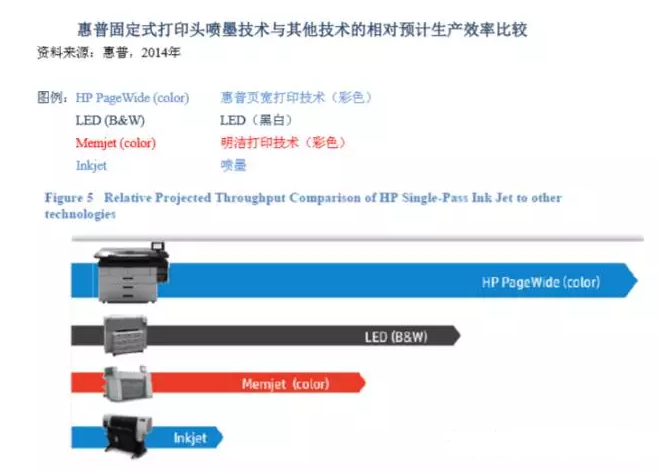惠普固定打印頭噴墨技術(shù)與其他技術(shù)的相對(duì)預(yù)計(jì)生產(chǎn)效率比較