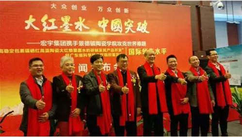 2016年1月14日上午9時(shí)30分,“大紅墨水 中國(guó)突破”宏宇集團(tuán)攜手景德鎮(zhèn)陶瓷學(xué)院攻克世界難題新聞發(fā)布會(huì)在佛山瓷海國(guó)際商務(wù)中心五樓舉行。廣東省建筑材料行業(yè)協(xié)會(huì)會(huì)長(zhǎng)吳一岳、中國(guó)建筑衛(wèi)生陶瓷協(xié)會(huì)副秘書長(zhǎng)尹虹、廣東宏宇集團(tuán)副總經(jīng)理歐家瑞、廣東宏宇集團(tuán)瓷片廠廠長(zhǎng)余國(guó)、景德鎮(zhèn)陶瓷學(xué)院材料學(xué)院副院長(zhǎng)汪永清、廣東宏宇集團(tuán)市場(chǎng)總監(jiān)王勇出席了發(fā)布會(huì)。會(huì)上,正式宣布中國(guó)首先在世界上研制成功高溫陶瓷大紅墨水。