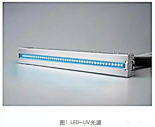 UV油墨憑借固化速度快、不含溶劑、印刷時免噴粉等優(yōu)勢,在印刷行業(yè)得到了廣泛應用。目前,印刷行業(yè)使用的UV固化裝置普遍采用高壓汞燈、金屬鹵素燈等傳統(tǒng)UV光源,不僅能耗高,使用過程中還會產(chǎn)生難聞的臭氧。為此,近年來業(yè)界研發(fā)出LED-UV光源(如圖1),因其能耗更低、固化效率更高,與配套的LED-UV油墨所組成的LED-UV固化技術正在成為印刷企業(yè)實現(xiàn)節(jié)能環(huán)保的“新寵”。