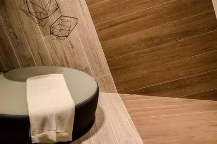 這塊瓷磚是將帶有光滑曲線和輪廓的釉面圖案層疊到天然石材圖案的上面,當光線從該圖案的不同部位反射時,會呈現(xiàn)出一種奇妙的光學效果。