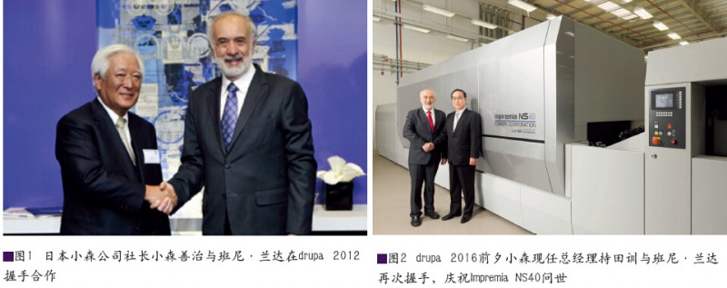 4年之后,在drupa 2016前夕,小森現(xiàn)任總經(jīng)理持田訓(xùn)與班尼·蘭達(dá)共同站在整裝待發(fā)參展的小森Impremia NS40展機(jī)前,再次握手相慶,多少艱難歲月一起度過,盡在不言中!