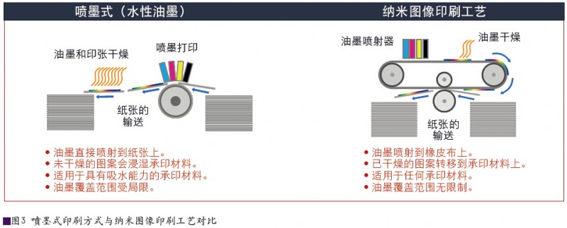 小森Impremia NS40采用了納米印刷工藝,被稱為納米圖像印刷工藝的新一代數(shù)字印刷機(jī)。這項革新的印刷工藝采用了Landa公司NanoInk(納米油墨)顏料,該水性納米油墨由僅僅幾十個納米色素顆粒組成。在納米印刷過程中,納米油墨將以數(shù)十億個微小的墨滴經(jīng)由噴墨打印頭噴射到加熱的橡皮布上。當(dāng)油墨落在加熱的橡皮布上時,油墨會散開并迅速失去水分,因此墨層變得更薄。當(dāng)所有水分被蒸發(fā)后,油墨變成一層超薄又干燥的聚合膜。當(dāng)壓印滾筒接觸到承印材料時,這層厚度僅為500納米的油墨薄膜無需滲透就會立即全部轉(zhuǎn)移到承印材料上。經(jīng)由納米印刷工藝印制的圖案,其防磨損和耐劃傷性都極強(qiáng),因此印張無需進(jìn)行印后干燥,而橡皮布上也不會殘留油墨。噴墨式印刷方式與納米圖像印刷工藝對比,詳見圖3。