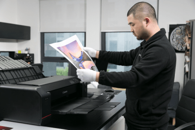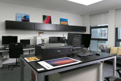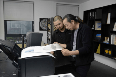 對(duì)于劉軼恒團(tuán)隊(duì)來說,日常工作中經(jīng)常遇到的一個(gè)棘手的問題就是,A2及A2以下幅面,并且輸出量不大的訂單。用大幅面打印機(jī)輸出的時(shí)候需要人工盯守,確保紙張平整,還需要裁切、壓平等工序,這些都消耗許多額外的成本。“那么對(duì)于這一類訂單,像佳能PRO-500這樣的桌面型打印機(jī)就非常好的解決了我們的‘痛點(diǎn)’,制作的時(shí)候只需要用Print Studio Pro軟件將參數(shù)設(shè)置好,將紙張放在托盤中,他就可以自動(dòng)打印了。”