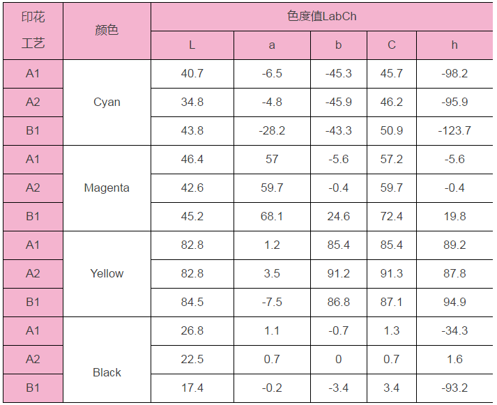 從表格中可以看出印花工藝b的飽和度全部高于不做前處理的印花工藝a,經過前處理品紅、黃色和黑色的飽和度有明顯改善。