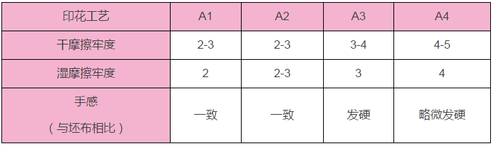 2.摩擦牢度偏低,提高牢度需要增加前后處理工藝。且易造成手感發(fā)硬;