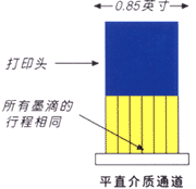 平直介質(zhì)通道(與早期HPDesignJet打印機(jī)中的介質(zhì)通道不同,早期HPDesignJet打印機(jī)中的打印介質(zhì)通道呈凸輥形狀)是打印機(jī)出色的打印速度的重要因素。因?yàn)榻橘|(zhì)鋪放的更平直、面積更大,所以一英寸打印頭可以更精確地將墨水噴射在更寬的0.85英寸的覆蓋寬度上。這樣,打印頭每次行程噴射出的墨水更多。