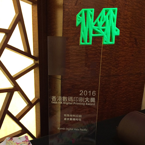 2016年12月2日,紡織品數(shù)碼印花的全球市場領(lǐng)導(dǎo)者康麗數(shù)碼(KornitDigital,納斯達(dá)克代碼:KRNT)宣布該公司獲得香港數(shù)碼印刷協(xié)會(huì)(HKDPA)頒發(fā)的“香港數(shù)碼印刷大獎(jiǎng)2016–銀獎(jiǎng)(特殊物料印刷)”。該獎(jiǎng)項(xiàng)是為了表彰康麗數(shù)碼提交作品的色彩活力和打印質(zhì)量,該作品為一件在KornitStormHexa機(jī)型上打印的100%滌綸拉鏈背心。