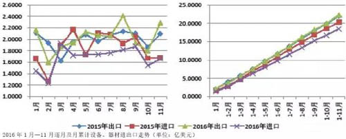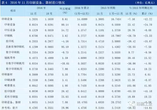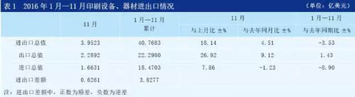 2016年1月—11月,印刷器材進口3.7704億美元,同比增長6.81%。