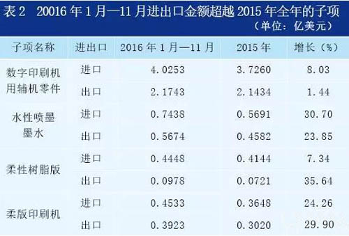 2016年1月—11月,柔版印刷機、數(shù)字印刷機用輔機零件、水性噴墨墨水及柔性樹脂版的進出口金額已經(jīng)超過2015年全年。