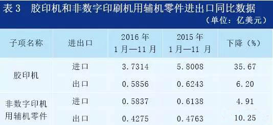2016年1月—11月,印刷設備進口14.6999億美元,同比下降12.22%。