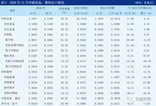 2016年1月—11月,印刷器材出口6.0849億美元,同比下滑5.78%。