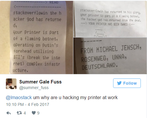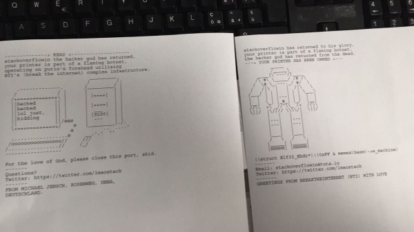 為了證明打印機(jī)存在的安全問(wèn)題,在過(guò)去的24小時(shí)內(nèi),Stackoverflowin用他自己寫(xiě)的一個(gè)自動(dòng)化腳本搜索網(wǎng)絡(luò)上所有開(kāi)放的打印機(jī)端口,然后向目標(biāo)設(shè)備制定了一些小的惡作劇。Stackoverflowin向目標(biāo)打印機(jī)發(fā)送了一個(gè)打印需求,結(jié)果目標(biāo)設(shè)備真的按照需求打印了。