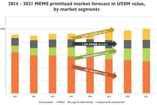 Yole預(yù)測2021年MEMS噴墨打印頭市場將增長至10億美元。隨著成熟的消費類打印市場持續(xù)萎縮,噴墨打印頭制造商將重新制定他們的市場策略,在辦公、商業(yè)和工業(yè)打印市場創(chuàng)造新機(jī)遇,這幾塊市場在2021年預(yù)計將達(dá)3.65億美元。