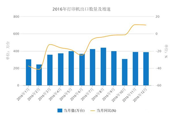 以下為2016年我國打印機出口數(shù)量統(tǒng)計: