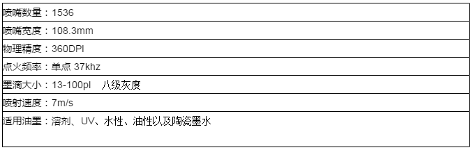 精工RC1536噴頭指標(biāo)參數(shù)中的性能指標(biāo)并不高,如噴嘴數(shù)為1536,有效噴嘴數(shù)為1040,分辨率只有360pdi,其打印寬度跟京瓷的噴墨打印頭一樣均為108mm,墨滴是13-150PL,點(diǎn)火頻率只有37KHz左右,但是精工RC1536噴頭匯集了其他品牌噴頭的優(yōu)勢(shì)。