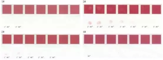 本方法利用臺(tái)式四色噴墨打印機(jī)打印M色塊(洋紅色),打印完畢后開(kāi)始計(jì)時(shí),根據(jù)不同的干燥速度可以設(shè)定不同的初始粘臟時(shí)間。粘臟壓力為1kg,面積為1cm2,接觸粘臟時(shí)間為3s。由于受環(huán)境溫濕度影響,該方法在恒溫恒濕條件下測(cè)試有較好的重復(fù)性。圖2為四種樣品的干燥速度的測(cè)試,圖中每個(gè)測(cè)試樣的上部分為打印的色塊,下部分為利用數(shù)碼熱升華轉(zhuǎn)印紙背面粘臟的結(jié)果??梢钥闯觯?#樣品干燥速度最快,3#樣品最慢。
