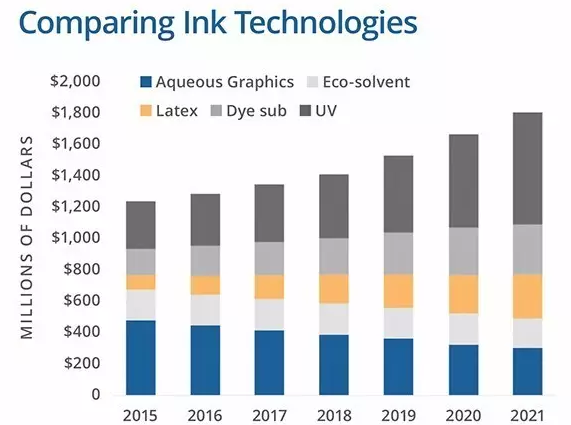 另一方面,Latex在某些情況下取代了生態(tài)溶劑和其他生產(chǎn)技術(shù),但也是根據(jù)其可實現(xiàn)的質(zhì)量,基材的多變性和生態(tài)友好性來尋找新的市場。Latex油墨在北美的價值為1.5億美元,IDC預(yù)計從2016年到2021年,其年均復(fù)合增長率為18%。從收入的角度來看,至少在北美,Latex墨水相對不受第三方墨水供應(yīng)商的影響, 而在生態(tài)溶劑領(lǐng)域,有大型公司涉及第三方墨水。到2019年,Latex墨水預(yù)計收入預(yù)計將超過生態(tài)溶劑型噴墨墨水的收入。