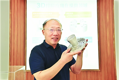 張海鷗教授展示運(yùn)用3D技術(shù)打印出的金屬零部件