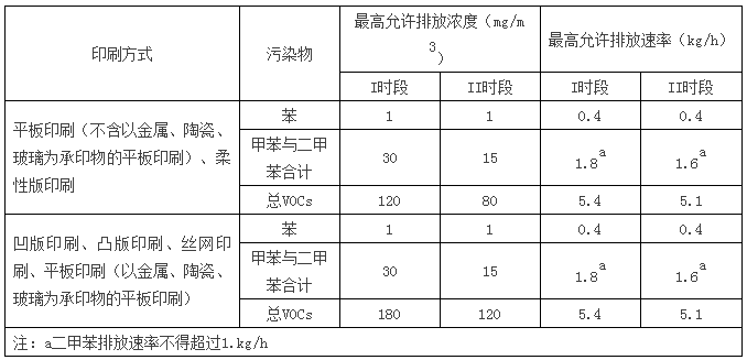 印刷生產(chǎn)活動(dòng)中,設(shè)備或車間排氣筒排放的揮發(fā)性有機(jī)物濃度應(yīng)執(zhí)行表2規(guī)定的限值。