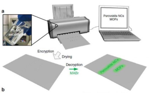 基于這種想法,張從陽(yáng)在后續(xù)實(shí)驗(yàn)中直接把MOFs用來(lái)作為記錄機(jī)密信息的載體,通過(guò)打印的方式印在紙上,噴上鹵鹽就可以迅速地產(chǎn)生熒光鈣鈦礦納米晶,印有信息的地方就產(chǎn)生熒光,信息就被讀出來(lái),也就是完成了解密過(guò)程。