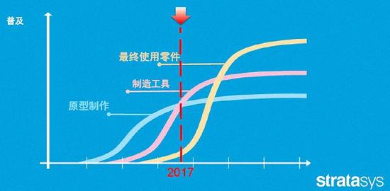 3D打印應(yīng)用的發(fā)展路徑可分為三個階段,原型制作-工裝夾具的制造-打印最終零部件,層層推進。目前,最大的應(yīng)用領(lǐng)域仍然是原型制作,也就是借助3D打印縮短產(chǎn)品設(shè)計循環(huán),加速推向市場。Stratasys認(rèn)為,目前市場正處于第一階段向第二階段過渡的拐點,最終零件生產(chǎn)開始起步。到2019年前后,3D打印在最終零件生產(chǎn)的應(yīng)用將超過工具制作的應(yīng)用。