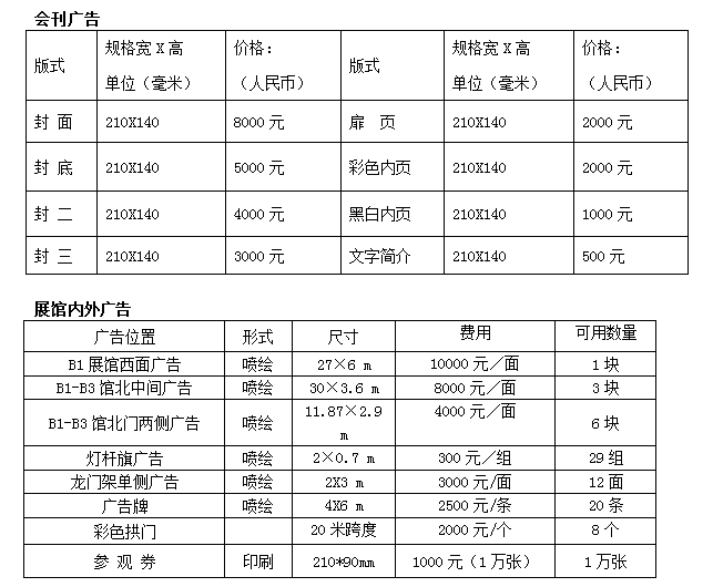 1、國(guó)際標(biāo)準(zhǔn)展臺(tái)(9 M²):國(guó)內(nèi)企業(yè)5000元/個(gè),國(guó)外企業(yè) $900/個(gè)(角位展臺(tái)加收10%);(含中英文楣板、三面圍板、一張洽談桌、兩把椅子、兩盞射燈、一個(gè)220V/2A電源插座、紀(jì)念品、客戶登記本、簽字筆、會(huì)場(chǎng)保安、會(huì)場(chǎng)清潔等);