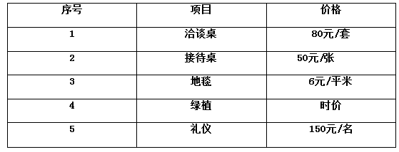 為了滿足展商的參展需求,組委會(huì)提供現(xiàn)場(chǎng)有償租賃服務(wù),項(xiàng)目包括洽談桌椅、接待桌、地毯、綠植、禮儀等。具體費(fèi)用見(jiàn)租賃明細(xì)表。