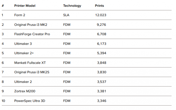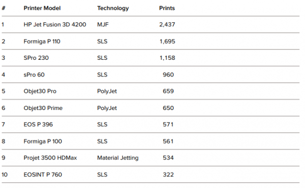 “最常用的工業(yè)打印機(jī)”顯示出一些明顯變化,前兩臺3D打印機(jī)交換位置,惠普上升到第一,F(xiàn)ormigaP100降到第八。