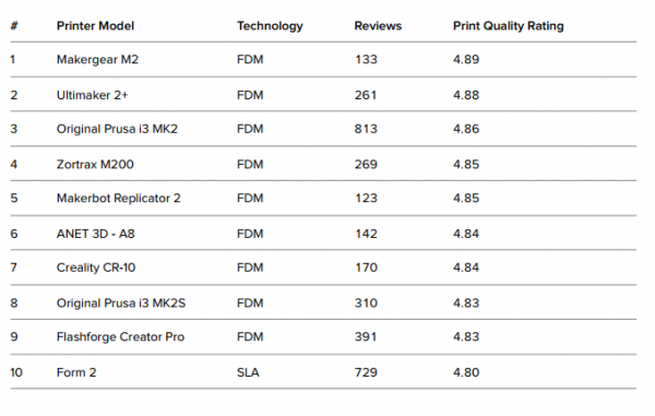 2018年第一季度,我們看到OriginalPrusai3MK2在上個季度被淘汰,取而代之的是MakergearM2。第二名是Ultimaker2+,OriginalPrusai3MK2排在第三位,ZortraxM200排在第二位。這個類別顯示了相當(dāng)大的變化,MakerBotReplicator2出現(xiàn)在第五位,ANET3D-A8在第六位,F(xiàn)lashforgeCreatorPro和Form2被打入到前十名的最后。