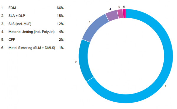 數(shù)據(jù)顯示FDM不僅在最常用3D技術(shù)的第一位,而且將其份額從61%提高到66%。SLA+DLP從SLS檢索到第二位,并且在第四季度與SLS記錄的百分比相同。降幅從17%下降到12%。