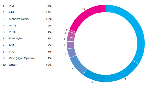 “使用最多的材料”當(dāng)然屬于FDM打印,因為PLA和ABS排在前兩位。PLA占有34%的市場份額,ABS從14%上升到16%。在第三位,標(biāo)準(zhǔn)樹脂在圖表的第三步也上漲了10%。PA12位列第四,成為SLS3D打印最受歡迎的材料。