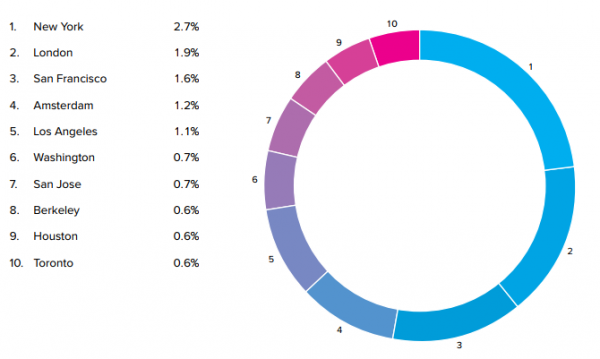 3DHubs指出:“美國和加拿大在”頂級城市“中占有三個城市,加拿大三個城市在這些國家中占有相當(dāng)大的比例,而美國則相反。
